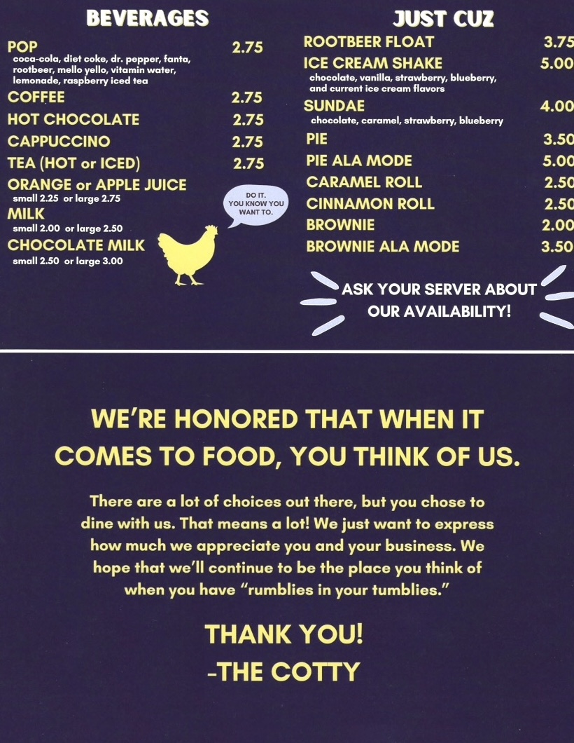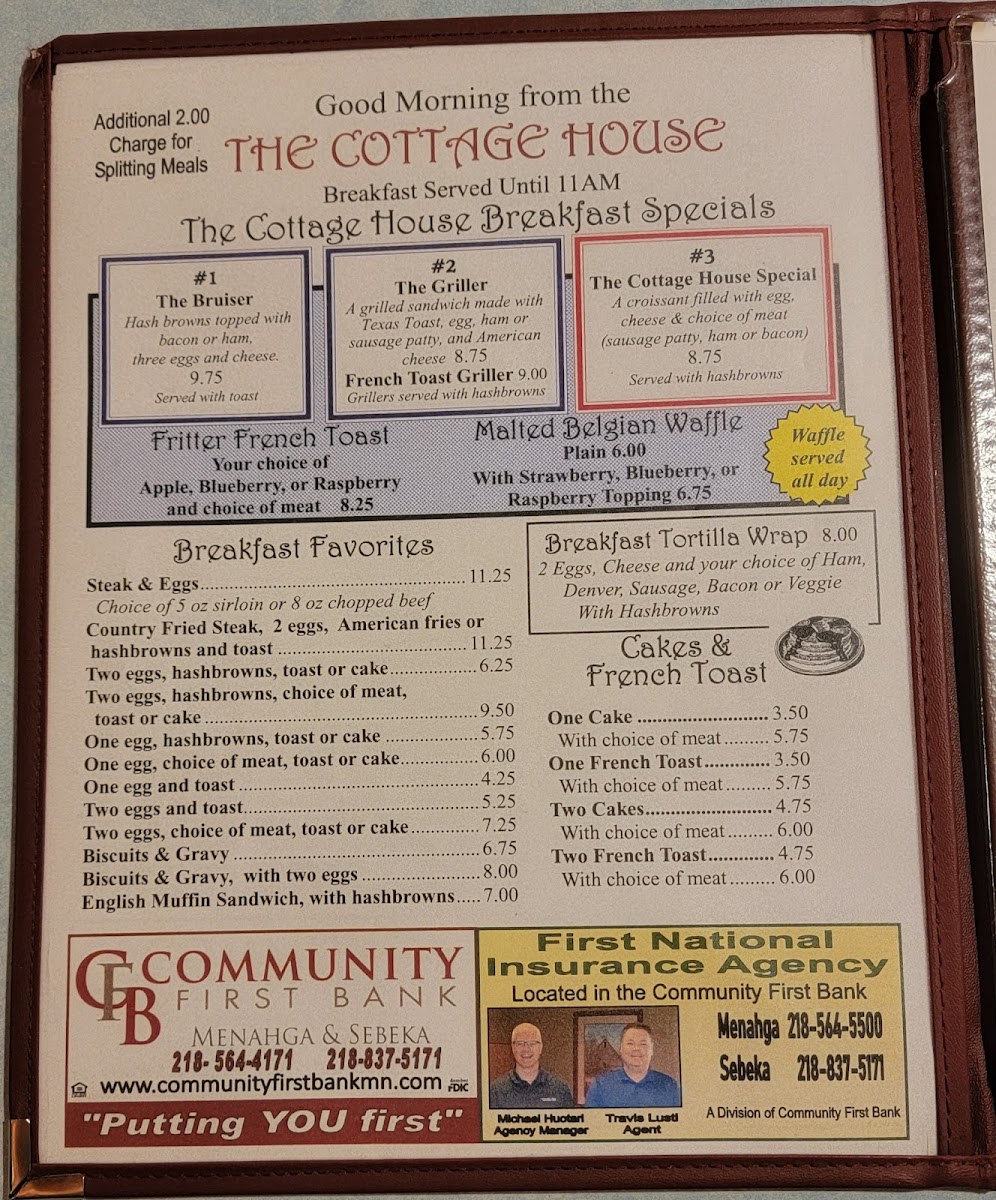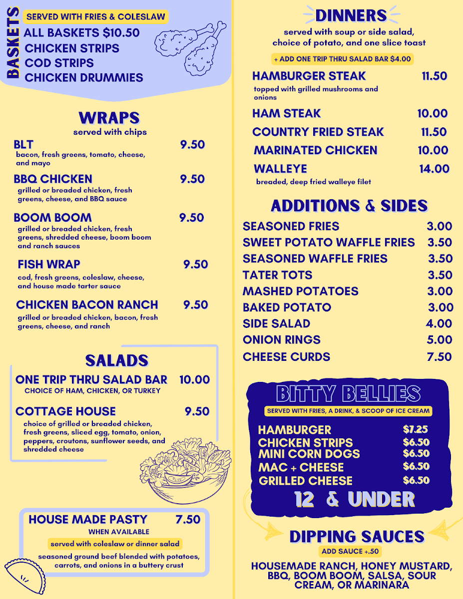 Welcome to The Cotty - Formerly Cottage House Cafe Menu, where the heart of Menahga meets the comfort of classic American dining. Nestled in the charming 119 Main St NE, this local gem offers a cozy atmosphere and a mouthwatering array of dishes that are perfect for any occasion. Whether you're craving a hearty breakfast to kickstart your day or a satisfying dinner to wind down, The Cotty delivers it all with warmth and flavor. From signature comfort foods to fresh seasonal specials, each item is crafted to bring a smile to your face. Every bite is a reminder of why this spot has become a favorite for locals and visitors alike.