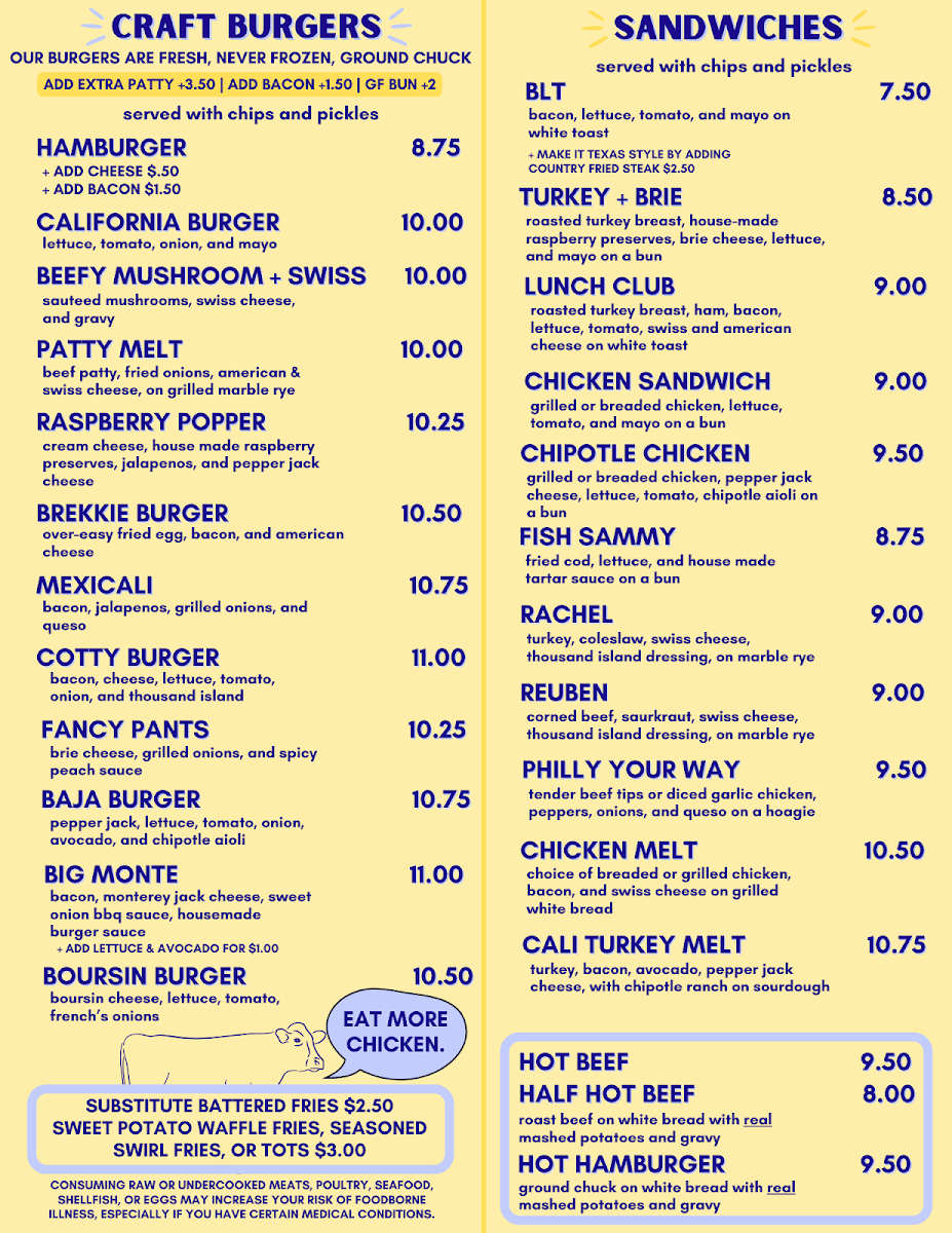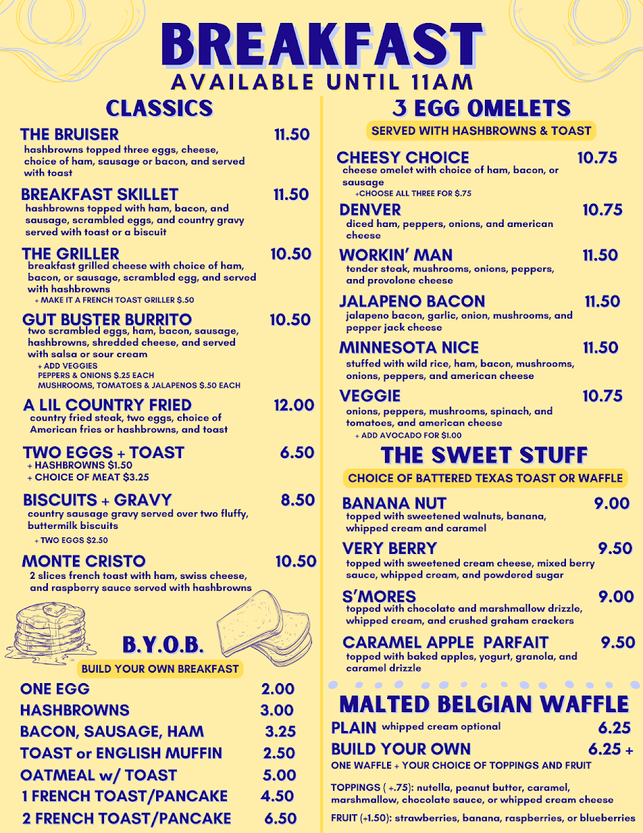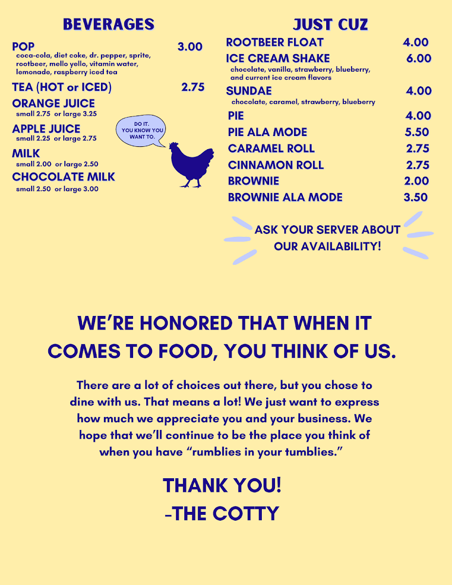 Welcome to The Cotty - Formerly Cottage House Cafe Menu, where the heart of Menahga meets the comfort of classic American dining. Nestled in the charming 119 Main St NE, this local gem offers a cozy atmosphere and a mouthwatering array of dishes that are perfect for any occasion. Whether you're craving a hearty breakfast to kickstart your day or a satisfying dinner to wind down, The Cotty delivers it all with warmth and flavor. From signature comfort foods to fresh seasonal specials, each item is crafted to bring a smile to your face. Every bite is a reminder of why this spot has become a favorite for locals and visitors alike.